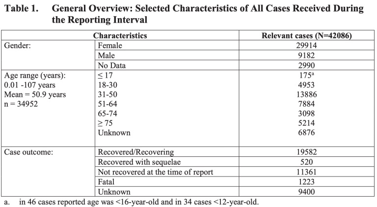 En conjunto, hasta el 28 de febrero de 2021 [en menos de tres meses], hubo un total de 42.086 informes de casos (25.379 confirmados médicamente y 16.707 no confirmados médicamente) que contenían 158.893 eventos. La mayoría de los casos (34.762) se recibieron de Estados Unidos (13.739), Reino Unido (13.404) Italia (2.578), Alemania (1913), Francia (1506), Portugal (866) y España (756); los 7.324 restantes se distribuyeron entre otros 56 países.