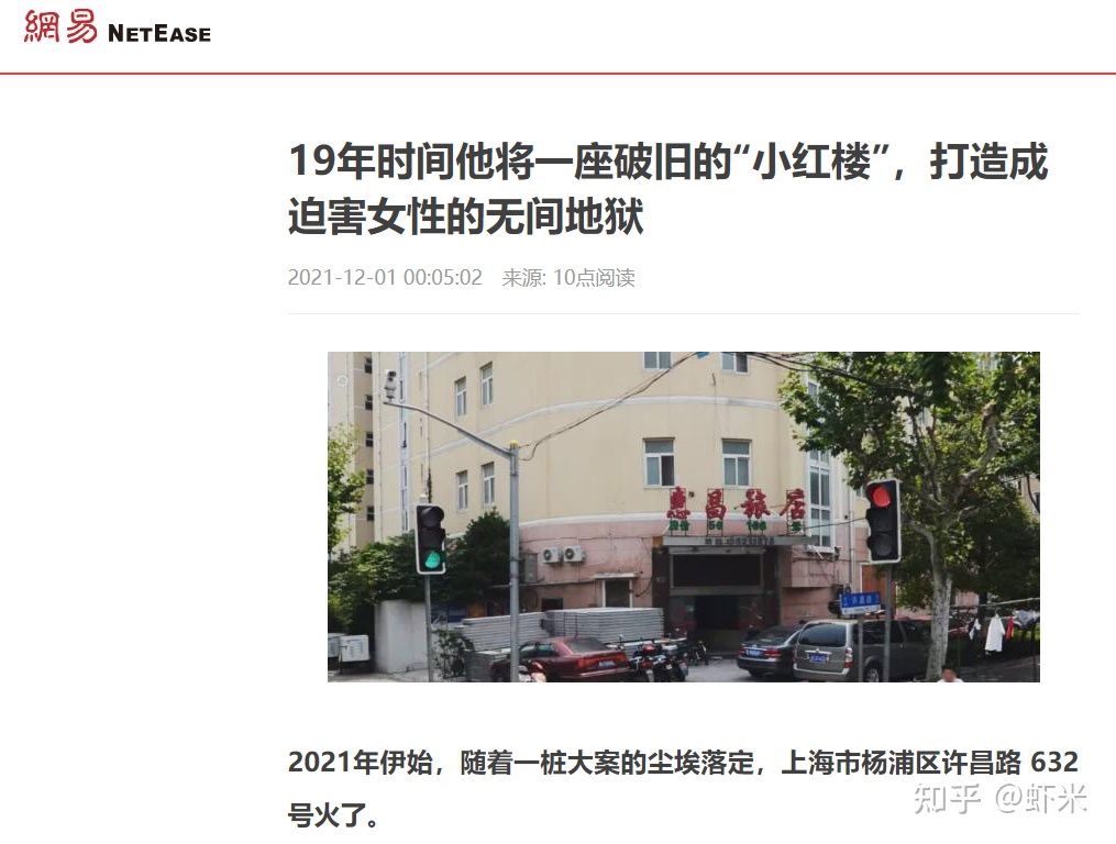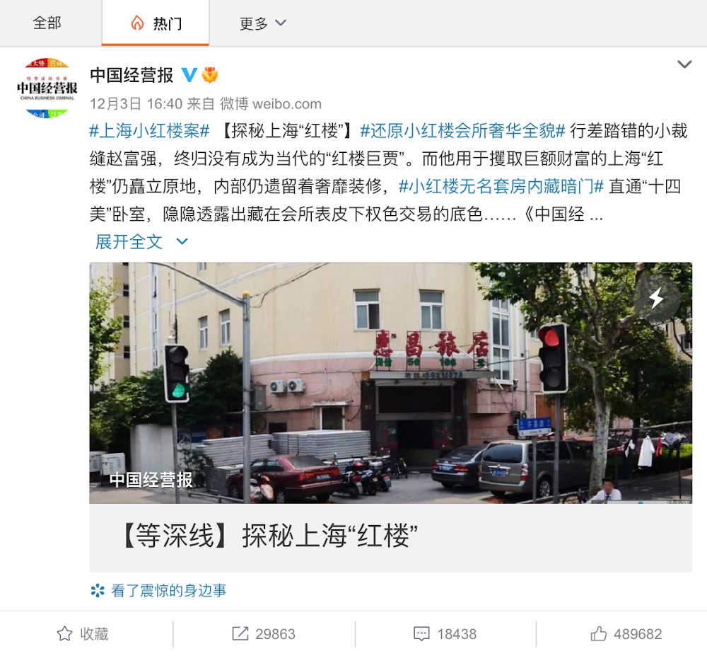 El título original de ese artículo era «En 19 años, convirtió la ruinosa «Pequeña Casa Roja» en el infierno en la Tierra para las mujeres victimizadas» («19年时 ?? 将一座破 ?? 的 «小红 ?? «, , 女性的无 ?? 地 ?? ). Fue publicado el 1 de diciembre a las 10 p.m. Reading (@10点 ?? ) en la plataforma de noticias Netease, pero desde entonces ha sido eliminado, aunque todavía está disponible en algunas otras plataformas. Del «salón de pelo» a la mansión El artículo principal explica cómo Zhao Fuqiang, originalmente un sastre de pueblo pequeño, llegó por primera vez a Shanghai en 2000 en busca del gran dinero y que se volvió activo dentro del mundo de la prostitución organizada. Su propia esposa, que estudió danza, supuestamente se convirtió por primera vez en prostituta antes de reclutar a un grupo más grande de trabajadoras migratorias jóvenes a través de la red de su esposa. El autor afirma que Zhao utilizó amenazas y violencia física para que estas jóvenes mujeres rurales trabajaran para él. Después de ser violadas, golpeadas y asustadas para pensar que se enviarían fotos desnudas de ellas a familiares y amigos, estas mujeres terminaron teniendo relaciones sexuales por dinero en una de las dos «peluquerías» de Shanghai recién establecidas de Zhao, donde los hombres pagarían 150 yuanes (23 dólares) por visita. Las mujeres nunca verían ni un centavo del dinero que ganaron para Zhao. Con el dinero que Zhao ganó a través de su negocio de «peluquería», se aventuró en el mundo de las tiendas de subarrendamiento en la ciudad. A través de la ayuda de su dudosa pero poderosa red, Zhao tuvo en sus manos más de 1000 tiendas que pudo subarrendar sin hacer nunca una gran inversión. En un período de tiempo de casi dos décadas, Zhao probablemente ganó alrededor de mil millones de yuanes (156 millones de dólares) con esto. Dado que su negocio era cualquier cosa menos legal, Zhao necesitaba una red de seguridad para protegerlo. No se podía ver a funcionarios superiores y figuras de grandes empresas visitando una de sus «peluquerías», por lo que necesitaba un lugar más seguro para dar la bienvenida a sus invitados. En la llamada Pequeña Mansión Roja de seis pisos en el distrito Yangpu de Shanghai, Zhao invitaría a empresarios y gubernamentales de alto nivel. Las cámaras de seguridad dentro del edificio las grabaron, sirviendo potencialmente como material de chantaje.