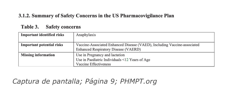 El «Resumen de las preocupaciones de seguridad en los EE. UU. Pharmacovigilance Plan» en la página 9 revela que Pfizer informó a la FDA que era consciente de que la «vacuna» de terapia génica podría causar «enfermedad mejorada asociada a la vacuna (VAED), incluida la enfermedad respiratoria mejorada asociada a la vacuna (VAERD)». En otras palabras, la FDA sabía que el jab de Pfizer podría dañar negativamente o incluso matar a pacientes que más tarde se infectaron con COVID-19.