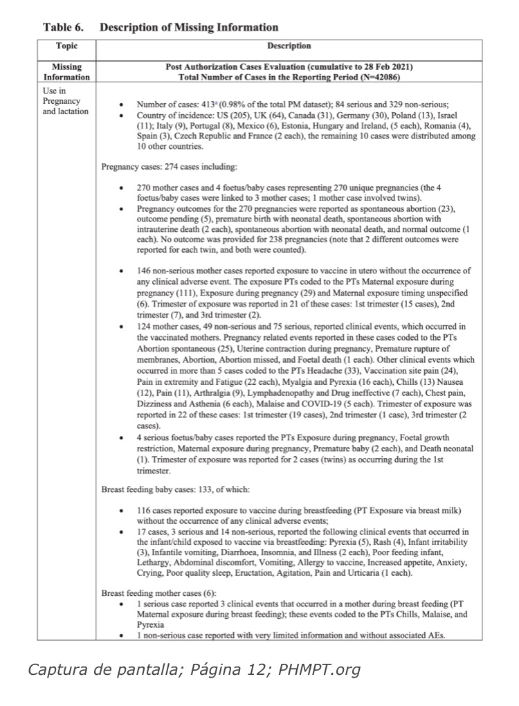 El cuadro 6 del informe muestra que, a pesar de «falta información», el uso de la vacuna Pfizer durante el embarazo y la lactancia involucró 413 casos, con 270 casos únicos de embarazo (los 4 casos de feto/bebé se vincularon a 3 casos de madre; 1 caso de madre involucró gemelos). De ese número, el informe muestra que la vacuna contra el ARNm está vinculada a los siguientes eventos adversos significativos del embarazo: