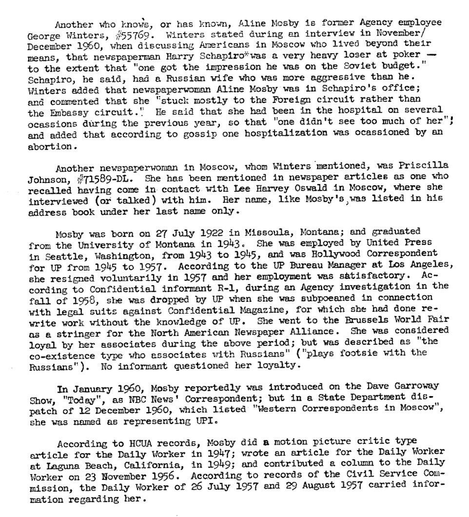 Marina, la esposa de Oswald, que era rusa, es referenciada en todos los archivos. Uno detalla cómo un estudiante marroquí se puso en contacto con la CIA después del tiroteo y afirmó que había sido su novio. Se desconoce la relevancia de eso para la investigación.