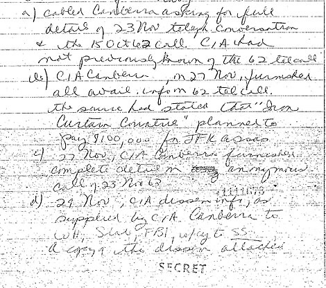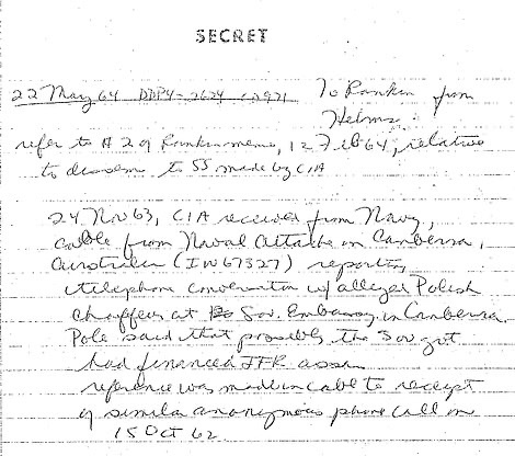 El 24 de noviembre de 1963, dos días después de que Kennedy fuera asesinado, el Agregado Naval en Canberra, Australia, envió por cable a la CIA que alguien que afirmaba ser un chofer polaco en la embajada de la Unión Soviética había llamado por teléfono para informar que «probablemente» el gobierno soviético había financiado el asesinato.