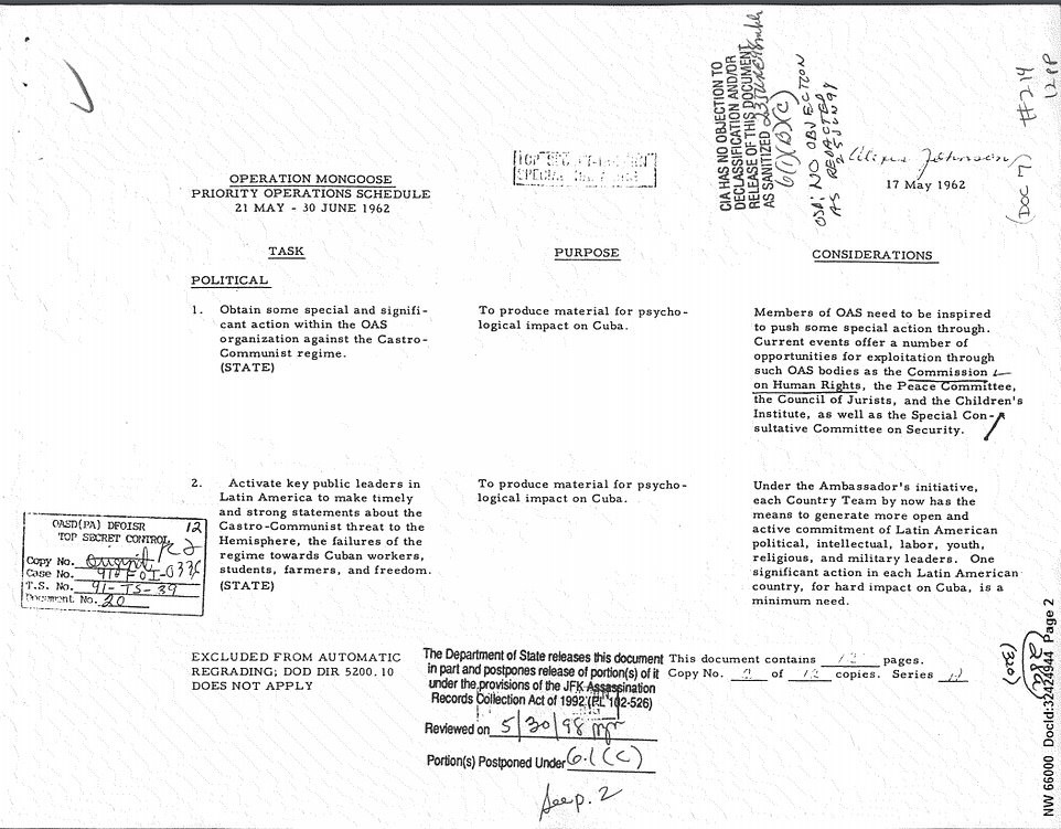 - Los documentos también incluían archivos previamente sellados sobre la Operación Mangosta, el plan de la CIA para desestabilizar al gobierno cubano y expulsar al poder a Fidel Castro
