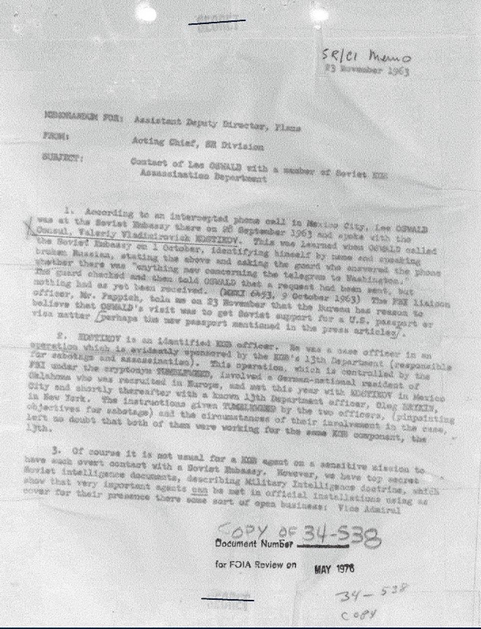 «Oswald llamó a la Embajada Soviética el 1 de octubre, identificándose por su nombre y hablando ruso roto, indicando lo anterior y preguntando al guardia que contestó al teléfono si había ‘algo relacionado con el telegrama a Washington’, un memorando escrito por el oficial de la CIA Tennent H. Bagley escribió el 23 de noviembre de 1963, al día siguiente del asesinato.