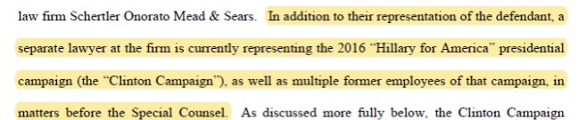 Según la última presentación de Durham, Stuart Sears es socio del bufete de abogados Schertler Onorato Mead & Sears. En particular, la firma representa actualmente a la campaña presidencial «Hillary for America» de 2016 (la «Campaña Clinton»), así como a múltiples ex empleados de esa campaña, en asuntos que tiene ante sí el Asesor Especial».