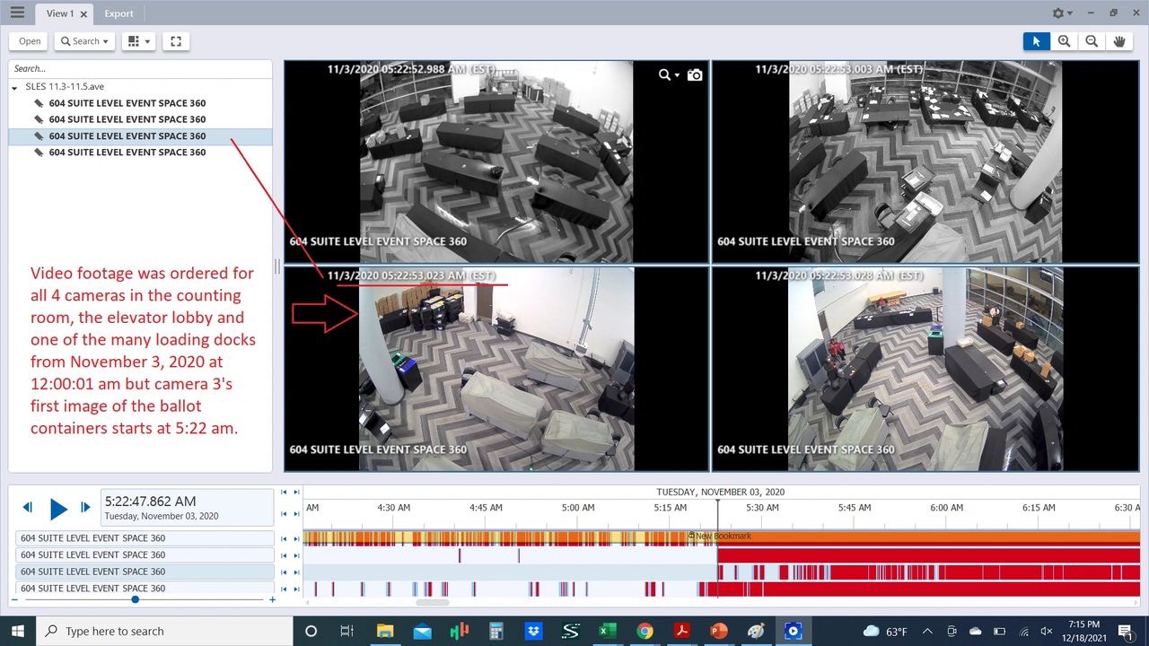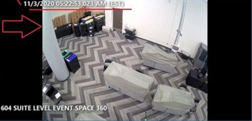 Se le pidió al condado de Fulton que proporcionara imágenes de vídeo para la sala de conteo en el State Farm Arena desde el 2 de noviembre a medianoche hasta el 4 de noviembre. El condado proporcionó imágenes dentro de la sala que tiene 4 cámaras, pero, de alguna manera, las imágenes de la cámara que muestran la puerta con las papeletas cargadas y el acceso al pasillo de servicio solo tienen imágenes a partir de las 5:22 a.m. del 3 de noviembre. Nada antes. ¿Qué esconden?