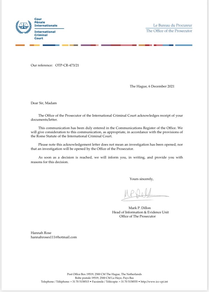 La CPI ha reconocido el caso y ha atribuido el siguiente número de referencia OTP-CR-473/21.
