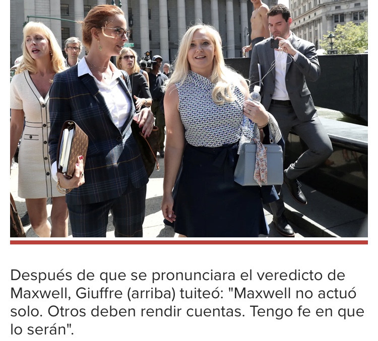 El miércoles, después de que se anunciaran las condenas de Maxwell, Giuffre tuiteó: «Espero que hoy no sea el final, sino más bien otro paso en la justicia que se haga justicia. Maxwell no actuó solo. Otros deben rendir cuentas. Tengo fe en que lo serán».