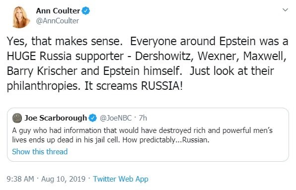Felicitaciones a Ann Coulter por ser los únicos conservadores prominentes dispuestos a denunciar quién estaba detrás de la operación de chantaje de Epstein/Maxwell.