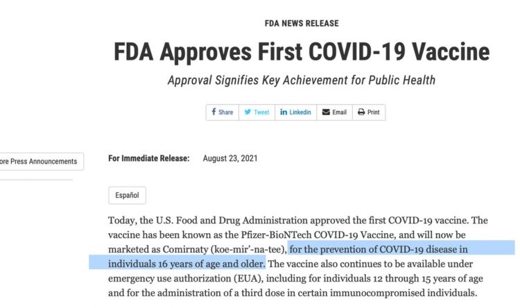 La FDA autorizó completamente las inyecciones de ARNm de Pfizer y Moderna bajo el argumento central de que fueron increíblemente efectivas para «detener la propagación» del COVID-19. La evidencia está disponible para que cualquiera pueda acceder a ella en el sitio web de la FDA.