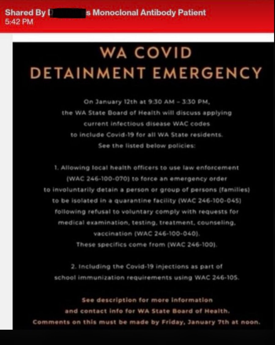 Las revisiones propuestas a WAC 246-100, que describe «Procedimientos de aislamiento o cuarentena», permitirían a los funcionarios de salud locales a «su otra discreción» «emitir una orden de detención de emergencia que haga que una persona o grupo de personas sea detenido inmediatamente con fines de aislamiento o cuarentena».