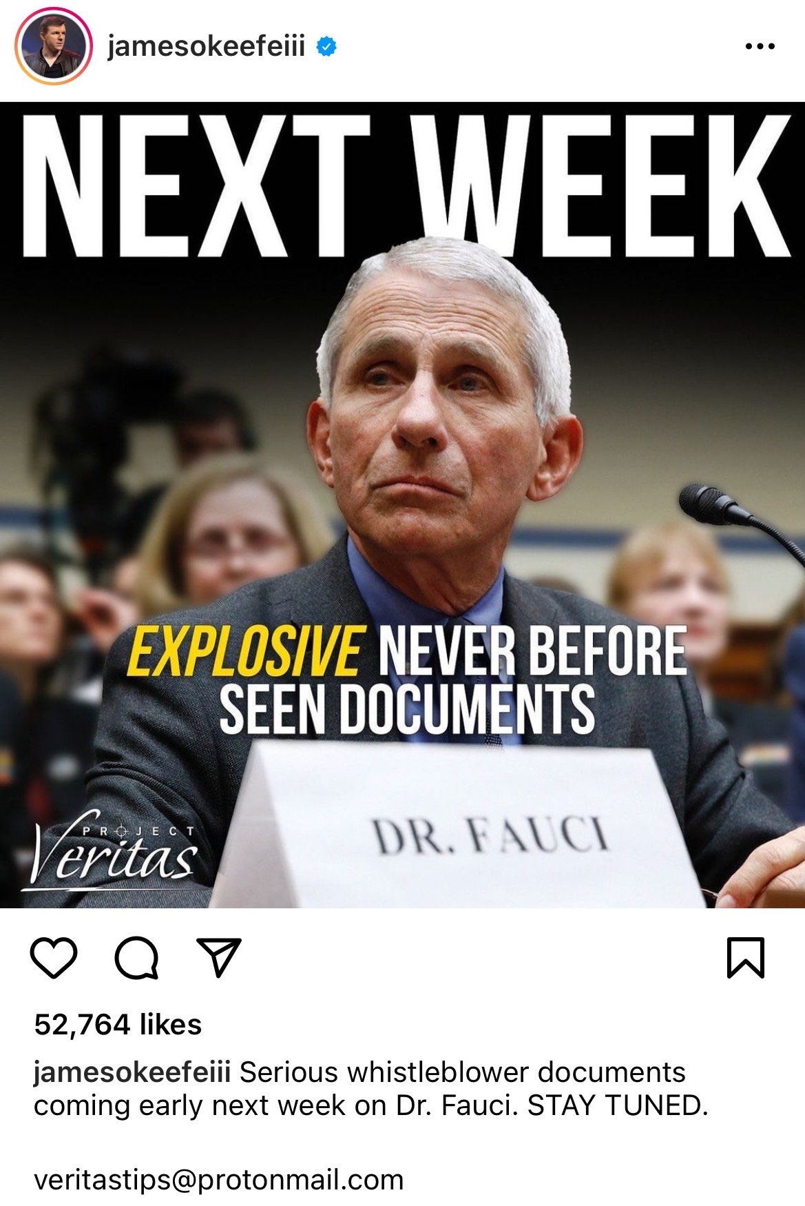 «Serios documentos de denunciantes que llegarán a principios de la próxima semana sobre el Dr. Fauci. MANTENTE ATENTO» anunció O’Keefe en su cuenta de Instagram.