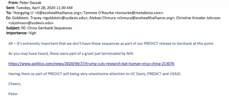 Daszak luego escribió: «Es extremadamente importante que no tengamos estas secuencias como parte de nuestro lanzamiento PREDICT a Genbank en este momento. Como habrás oído, estos fueron parte de una subvención que acaban de terminar los NIH». Se refirió a un artículo en Politico, «Trump recorta la investigación estadounidense sobre la transmisión del virus murciélago-humano por los lazos con China», e instó a posponer el intercambio público de datos genómicos virales chinos, a pesar de que la generación de los datos fue financiada por contribuyentes estadounidenses. «Tenerlos como parte de PREDICT será [sic] una atención muy desagradable a UC Davis, PREDICT y USAID», escribió Daszak.