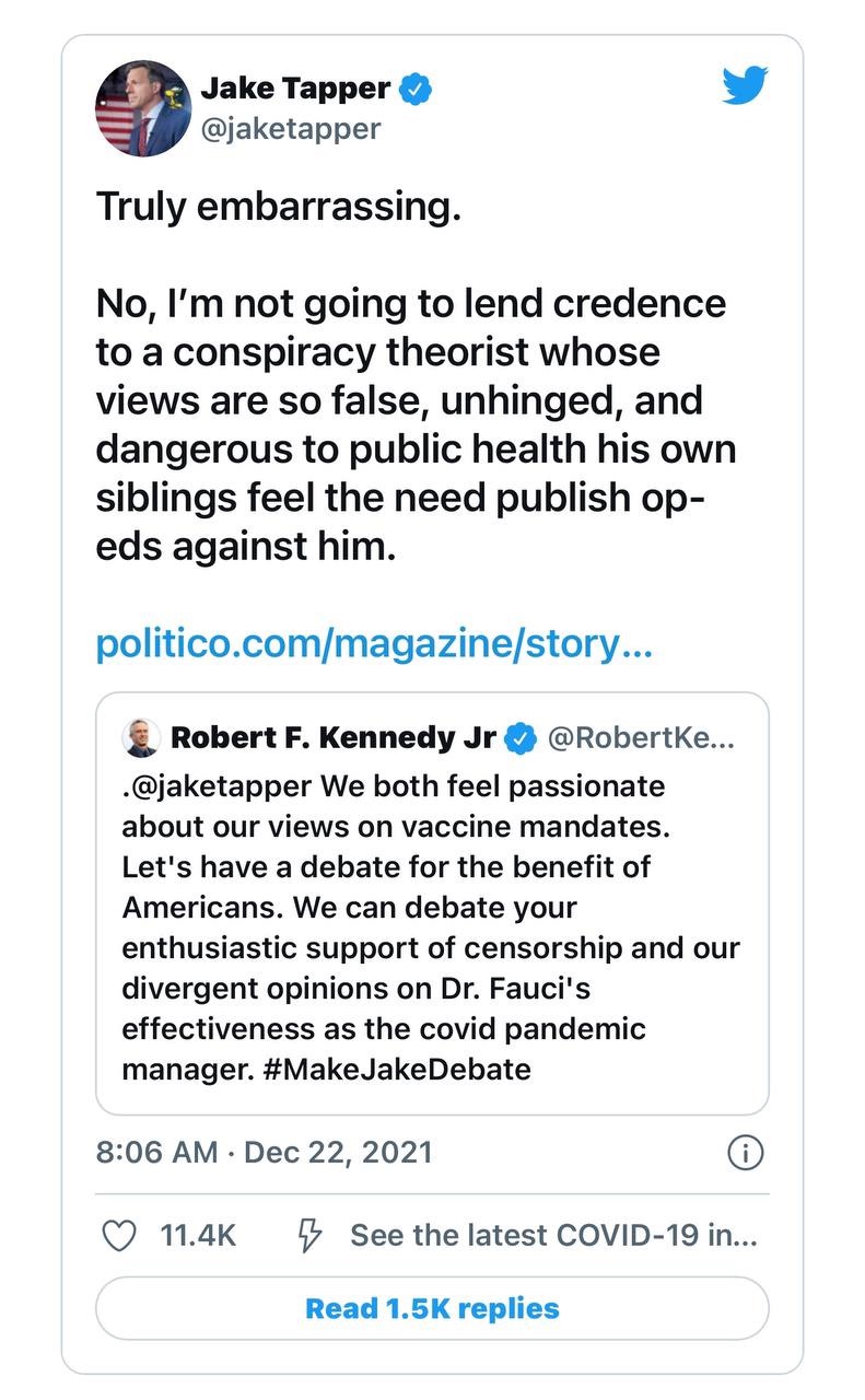 Robert Kennedy Jr. luego se ofreció a debatir públicamente sobre Tapper sobre sus acusaciones. Tapper lo rechazó sarcásticamente y continuó atacando a Kennedy Jr. en su Twitter:
