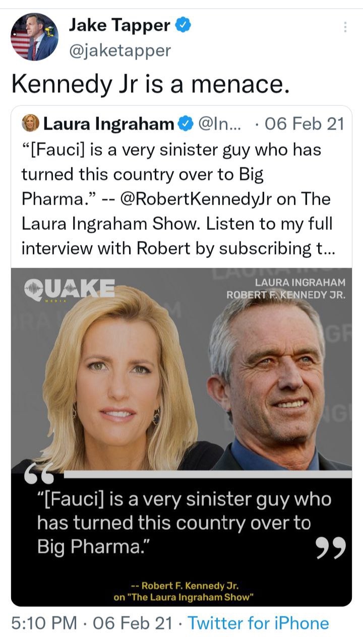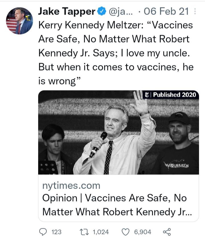 Desconcertado por la creciente popularidad del explosivo libro del autor Robert Kennedy Jr. «The Real Anthony Fauci«, la semana pasada el presentador de CNN Jake Tapper recurrió a su cuenta de Twitter para menospreciar al autor como un «mentiroso» y un «teórico de la conspiración» vendiendo aceite de serpiente al público mientras difamaba a