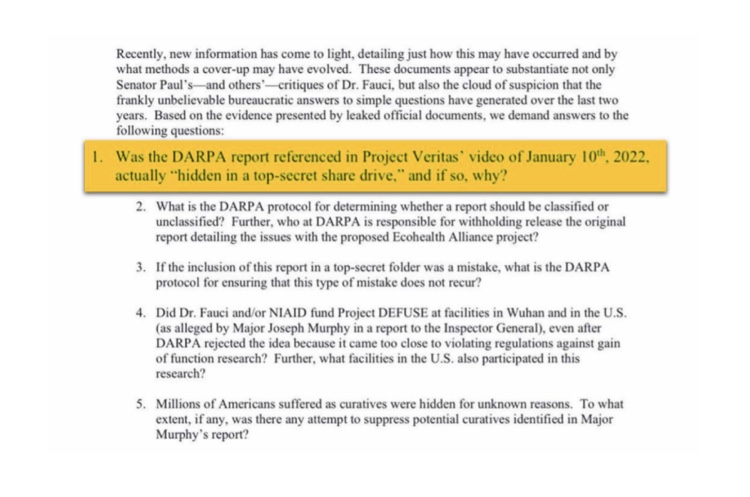 [WASHINGTON DC – 13 de enero de 2022] Miembros de ambas cámaras del Congreso han enviado mordaces cartas a funcionarios gubernamentales que buscan respuestas tras los documentos militares descubiertos por el Proyecto Veritas que revelaron una propuesta de EcoHealth Alliance para investigar los coronavirus transmitidos por murciélagos que fue rechazada por DARPA y un posible encubrimiento de esos documentos.