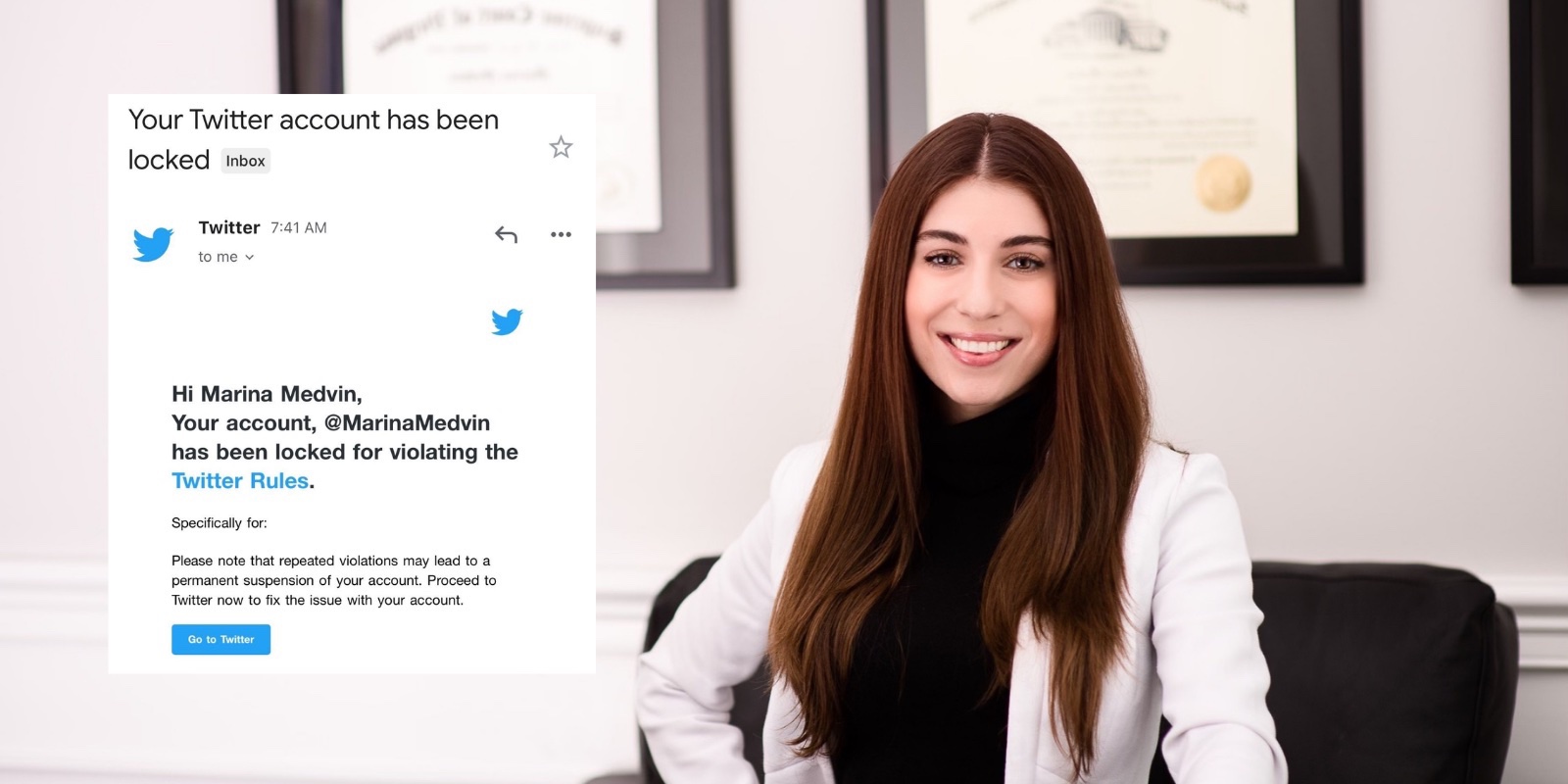 «Tu cuenta, @MarinaMedvin, ha sido bloqueada por violar las Reglas de Twitter. Específicamente para:»