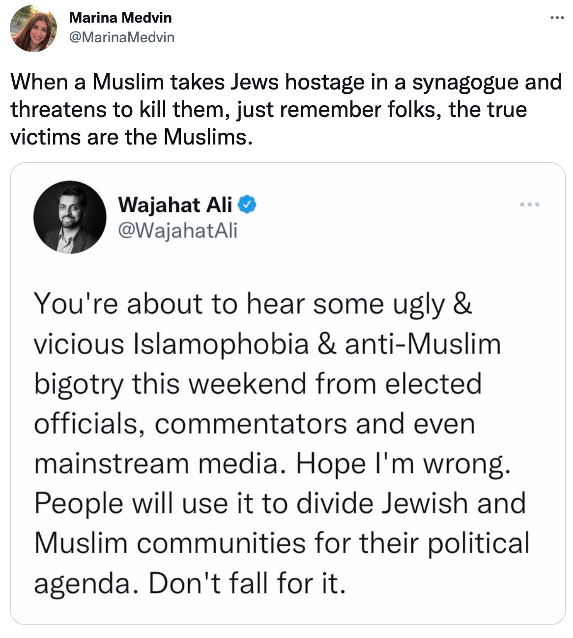 Wajahat Ali del Daily Beast escribió en Twitter que «Estás a punto de escuchar algo de islamofobia fea y viciosa e intolerancia antimusulmana este fin de semana de funcionarios electos, comentaristas e incluso medios de comunicación convencionales. Espero equivocarme. La gente lo usará para dividir a las comunidades judía y musulmana para su agenda política. No te enamores de ello».