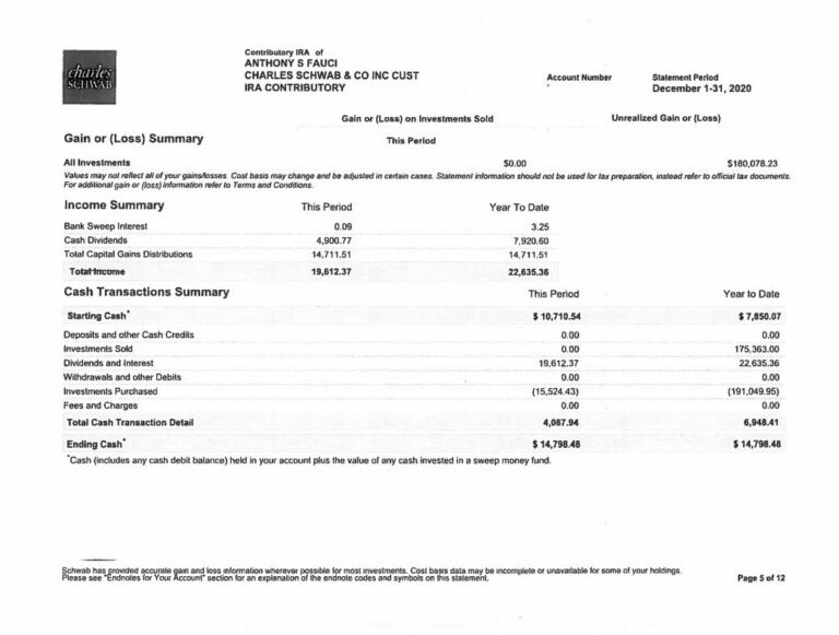 «Estos fondos se mantuvieron en una combinación de cuentas de fideicomiso, jubilación y educación universitaria. Fauci tiene una cuenta IRA por valor de 638.519 dólares (un aumento de 42.291 dólares); una cuenta de corretaje de beneficios definidos por un total de 2.403.522 dólares (un aumento de 241.418 dólares); y un fideicomiso revocable por valor de 5.295.898 dólares (un aumento de 342.694 dólares). El fideicomiso revocable de su esposa vale 1.962.819 dólares (hasta 156.123 dólares) y una cuenta IRA por un total de 120.277 dólares (hasta 11.843 dólares)», agregó OpenTheBooks.