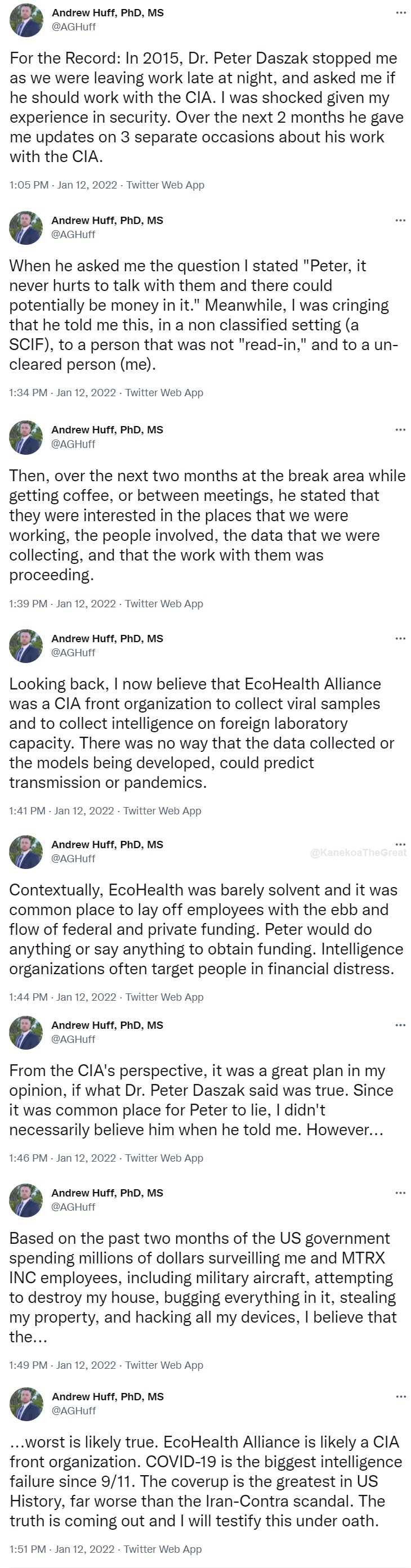 El 12 de enero de 2022, el Dr. Andrew Huff emitió una declaración pública (en Twitter) en la que afirmaba que Peter Daszak, presidente de EcoHealth Alliance, le dijo que estaba trabajando para la CIA.