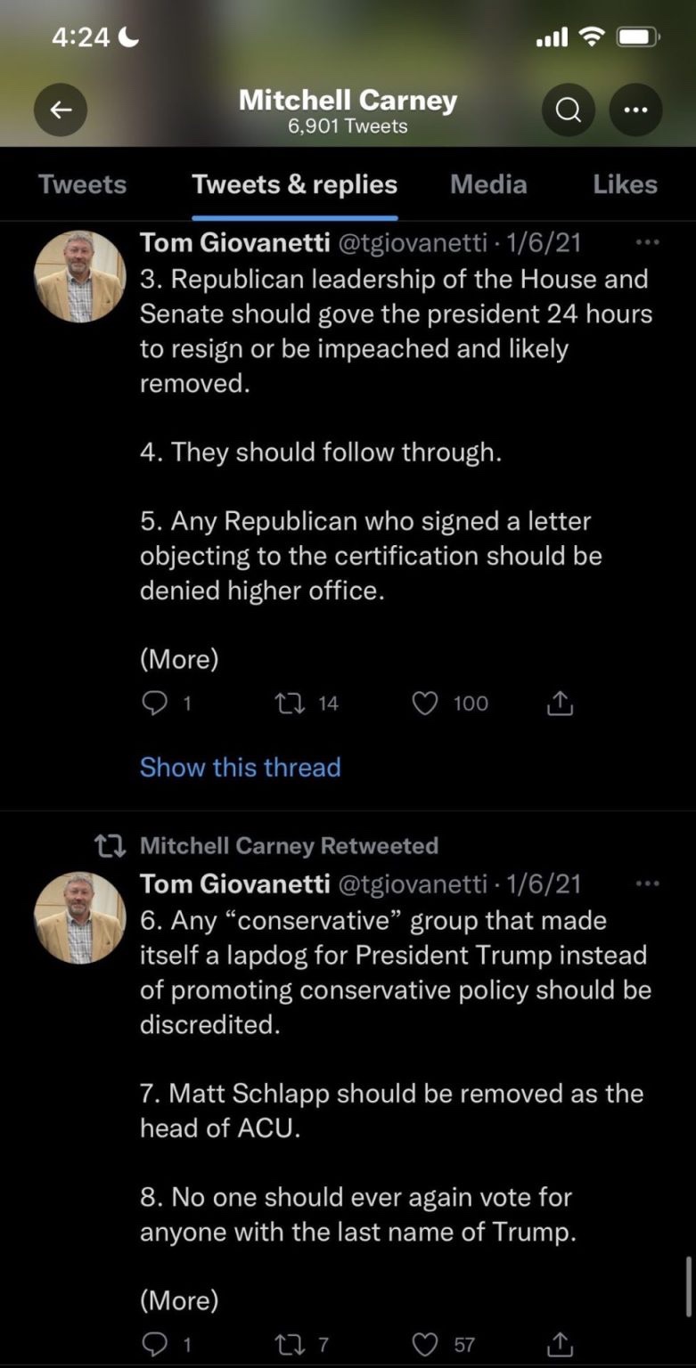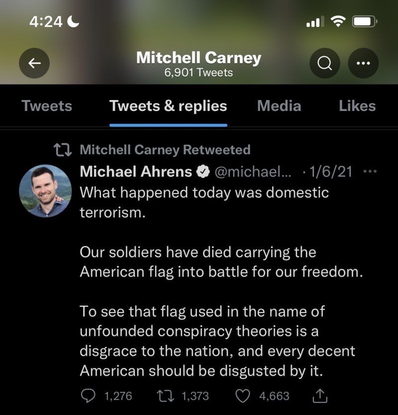Ese día y desde entonces, Carney escribió, compartió y le gustaron los tuits en su cuenta política que demuestran irrefutablemente que es un compatriota de los representantes. Liz Cheney, Adam Kinzinger y los otros traidores republicanos que se unieron a los demócratas para apoyar la extra divulgación ilegal e inconstitucional que se está utilizando como pretensión de destrozar la Carta de Derechos y promulgar una guerra contra el terrorismo contra los patriotas estadounidenses.