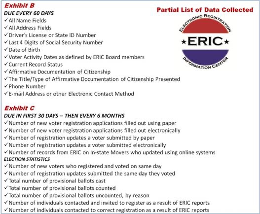 ERIC exige datos adicionales, como el número total de votos provisionales emitidos (véase la prueba B&C). Ellos. Quieren que se cuenten los totales de las papeletas provisionales, las provisionales no se cuenten y por qué. Quieren saber quién registró o actualizó sus datos, y luego votaron ese mismo día. Requieren datos sobre aquellos que se registraron usando papel y aquellos que usan métodos electrónicos. También quieren una lista de todas las personas en otras agencias que realizan funciones de registro de votantes. Esto incluye personal de bibliotecas públicas, Departamento de Seguridad Pública, Desempleo, Departamento de Salud, Servicios Sociales, etc.