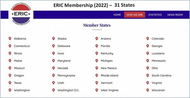 J. Christian Adams de PILF explica: «La historia de ERIC es importante. Kansas State Cross Check fue un grupo de estados que hicieron esto de forma gratuita. Esto hizo que los izquierdistas se volvieran locos. Demandaron a los estados participantes de Cross Check, en particular a Indiana, y obtuvieron órdenes judiciales para cerrar básicamente Cross Check. Ya no hay un competidor para ERIC. Una vez que esto sucedió, los estados rojos comenzaron a unirse a ERIC como GA, FL, TX. Esto es lo que realmente abrió las puertas de inundación al poder de ERIC. Si un estado como Georgia quiere saber quién está registrado tanto en Luisiana como en Georgia, no hay nadie más.