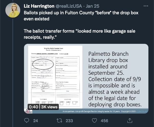 En 2020, no hubo cadena de custodia para la recolección de papeletas que se permitió hacer a los demócratas. Solo mira el condado de Cobb. No transportó las papeletas de los buzones de entrega de manera oportuna, manteniéndolas hasta tres días sin ninguna razón conocida.