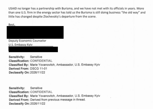 «USAID ya no tiene una asociación con Burisma, y no nos hemos reunido con sus funcionarios en años», dijo el Consejero Económico Adjunto de los EE. UU. Embajada en Kiev escribió. «Más de una empresa estadounidense en el sector energético nos ha dicho que [sic] Burisma todavía está haciendo negocios ‘a la antigua usanza’ y poco ha cambiado a pesar de la desviación de Zlochevskiy de la escena».