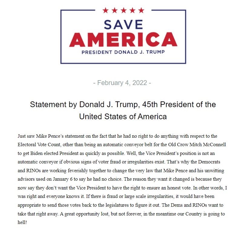 El presidente Trump respondió al ex vicepresidente Mike Pence, quien afirmó ayer que no tenía más remedio que certificar los resultados fraudulentos de las elecciones de 2020. El Presidente no estuvo de acuerdo y compartió que Pence tenía el deber de intervenir «si existen signos obvios de fraude o irregularidades de los votantes».