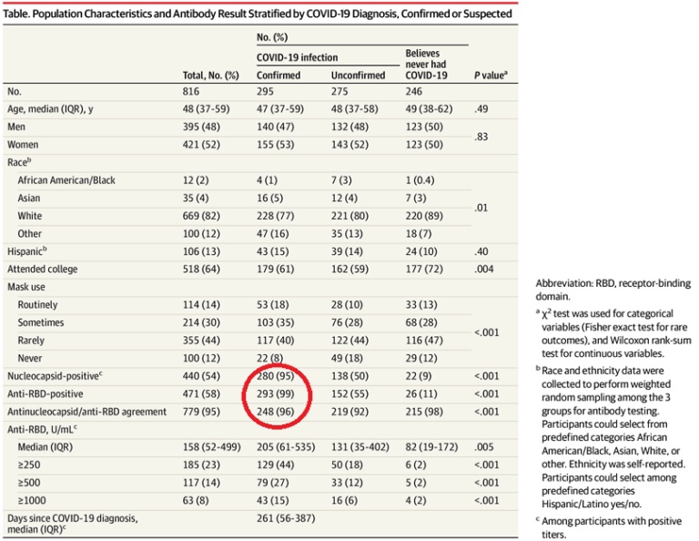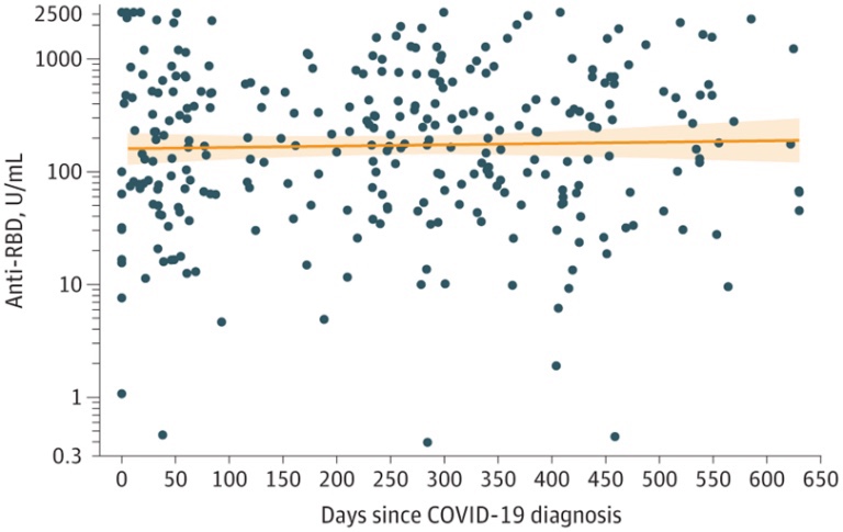 De las 1580 personas invitadas a someterse a pruebas serológicas, 816 (52%) lo hicieron entre el 24 de septiembre de 2021 y el 5 de noviembre de 2021. Los participantes tenían una edad media de 48,0 años, 421 (52%) eran mujeres y 669 (82%) eran blancos (Tabla). El catorce por ciento informó sobre el uso rutinario de máscaras en público. La presencia/ausencia de anticuerpos anti-RBD y anti-N se correlacionaron (95%; Cohen κ=0,908).De los 295 participantes confirmados por COVID notificados, 293 (99%) dieron positivo para anticuerpos anti-RBD (≥250 U/ml, 44%; ≥500 U/mL, 27%; ≥1000 U/mL, 15%). Una mediana de 8,7 (IQR, 1,9-12,9; rango, 0-20) meses pasó desde el diagnóstico reportado de COVID-19. La mediana del nivel anti-RBD entre aquellos que dieron positivo fue de 205 (IQR, 61-535) U/ml. No hubo evidencia de asociación entre el tiempo después de la infección y el título de anticuerpos (aumento del 0,58 % [IC 95%, -2,4 % a 4,2 %] por mes, P = 0,62) (Figura).