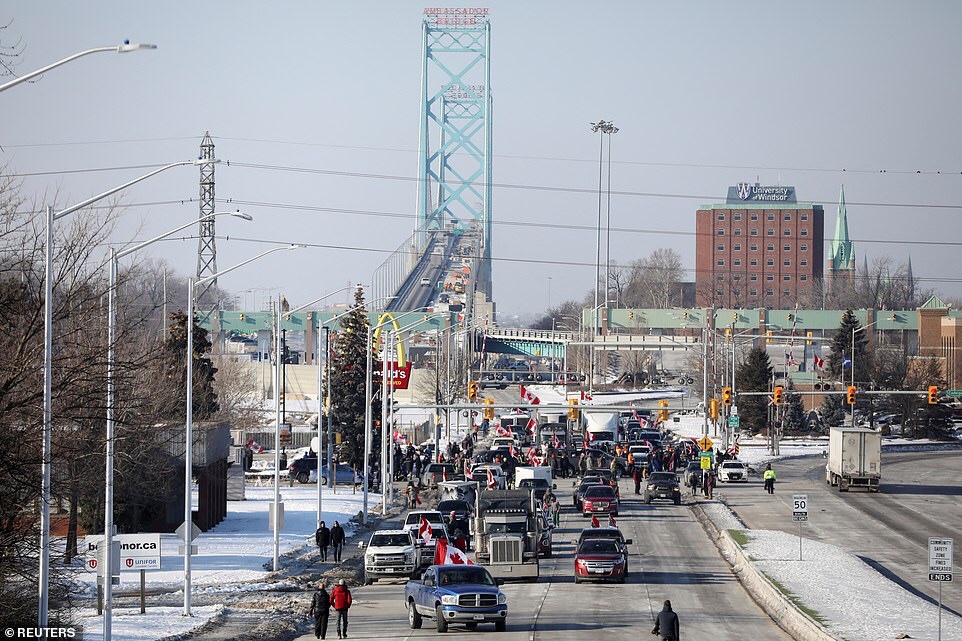 - Las manifestaciones continuaron hasta el martes cuando los camiones bloquearon el tráfico en el Puente Ambassador, el cruce fronterizo más transitado hacia los Estados Unidos, entre Detroit y Windsor, Ontario.