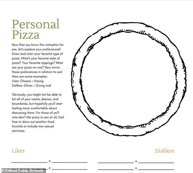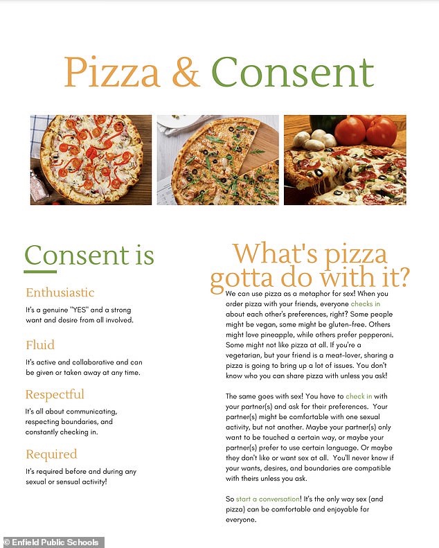 Los estudiantes de John F. Kennedy Middle School en Enfield recibió recientemente la tarea de «Pizza y Consentimiento», que pedía a los estudiantes que compararan sus ingredientes favoritos de pizza con sus actos sexuales favoritos.