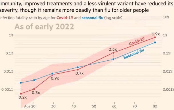 Pero lo más importante es que la tasa de muertes por infecciones (IFR) a principios de 2022 muestra que fue mayor para la gripe estacional que para la Covid-19 para la demografía de menores de 40 años (!).