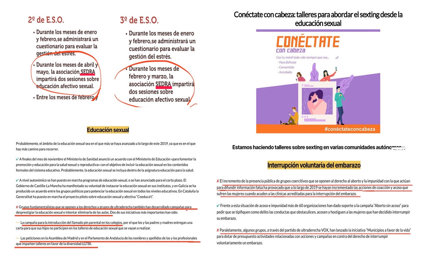 Así, según se desprende de la información pública a la que se accede con una simple visita a su página web, podemos comprobar la enorme carga de ideologización que contiene la entidad: la asociación SEDRA-Federación de Planificación Familiar defiende una ampliación del aborto en España, relacionándolo siempre como un método anticonceptivo más, defendiendo que las menores que deseen a abortar lo hagan sin consentimiento de sus progenitores, queriendo «establecer un mecanismo de control de la información que se ofrece a las personas que van a abortar en todas las CC.AA., para que sea ‘imparcial’ y no cuestione la decisión de las personas gestantes», restringiendo el derecho a la objeción de conciencia del personal sanitario, etcétera.