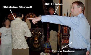 Sin embargo, en la imagen, el Sr. Clinton se para en el fondo frente a los tronos mientras Maxwell mira y se ve al príncipe Andrés señalando la distancia.