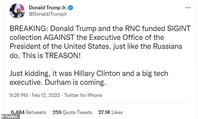 Donald Trump Jr. se hizo eco de las palabras de su padre en Twitter, escribiendo: «ÚLTIMA HORA: Donald Trump y la CNR financiaron la colección SIGINT CONTRA la Oficina Ejecutiva del Presidente de los Estados Unidos, al igual que lo hacen los rusos. ¡Esto es TRAICIÓN!