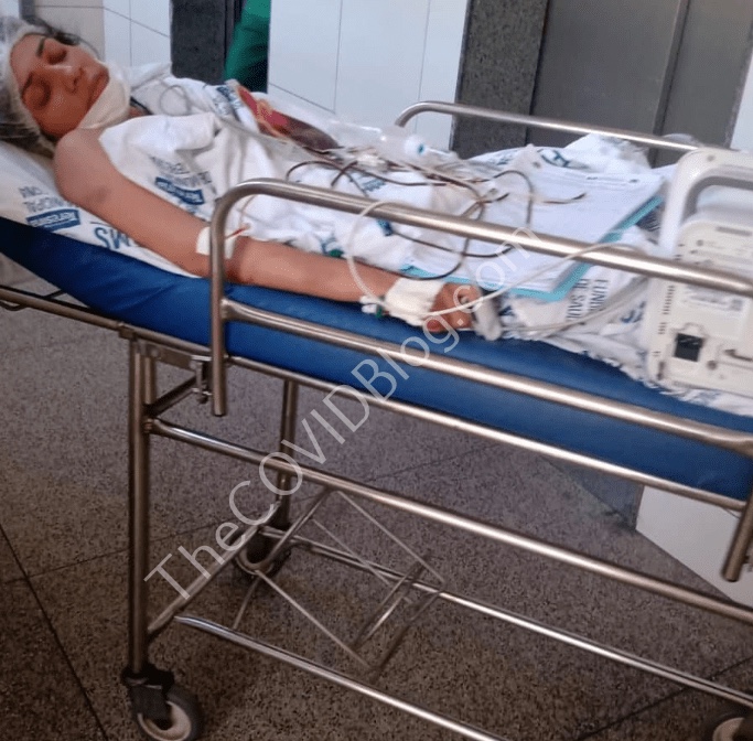 La ecografía reveló trombosis venosa (coágulos de sangre) en su pierna izquierda. Sra. Santos fue trasladado a otro hospital en Araguaína. Los médicos intentaron limpiar los coágulos de sangre de su pierna, en vano. Su pie izquierdo estaba aún más hinchado y púrpura en ese momento, pocas horas después.