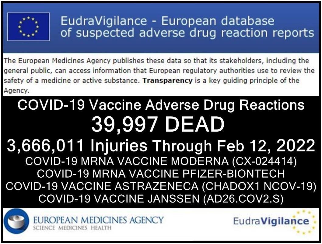 La base de datos europea (países EEE y no pertenecientes al EEE) de informes de sospechas de reacción a medicamentos es EudraVigilance, verificada por la Agencia Europea de Medicamentos (EMA), y ahora están reportando 39.997 muertes y 3.666.011 lesiones después de inyecciones de cuatro vacunas experimentales contra COVID-19: