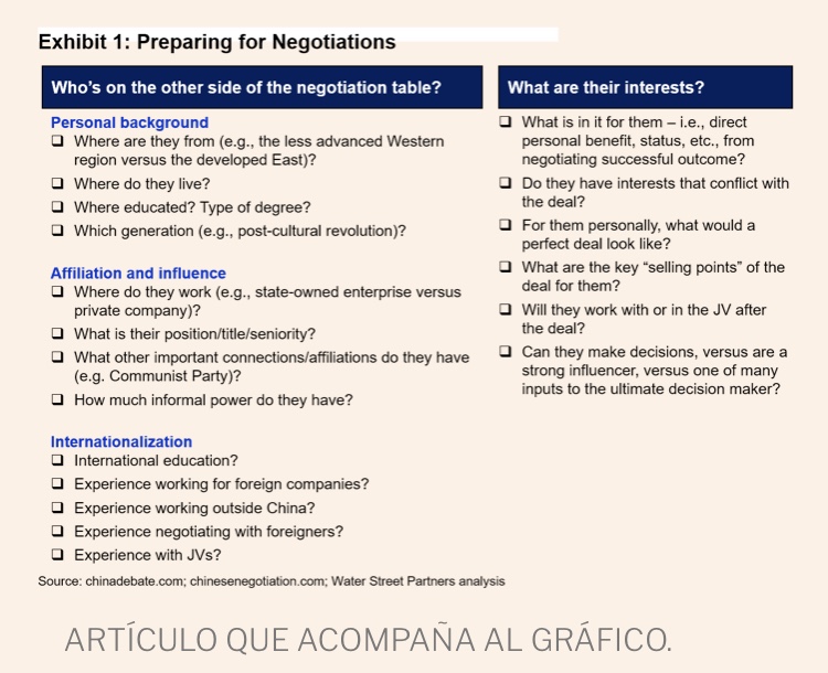El artículo también incluye un gráfico que detalla cómo prepararse para las negociaciones, incluyendo preguntas como «¿qué otras conexiones importantes tienen? (p. ej. ¿Partido Comunista Chino)?» y «¿dónde trabajan (por ejemplo, empresa estatal frente a empresa privada)?»