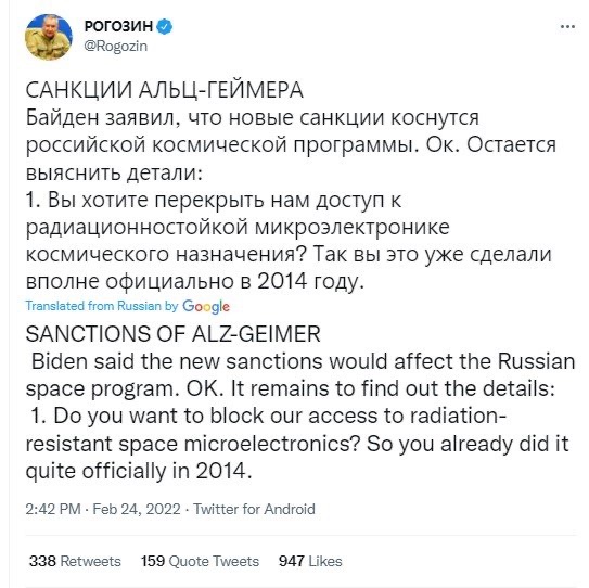 Dmitry Rogozin reprendió el último intento de Estados Unidos de castigar y controlar a Putin y Rusia.