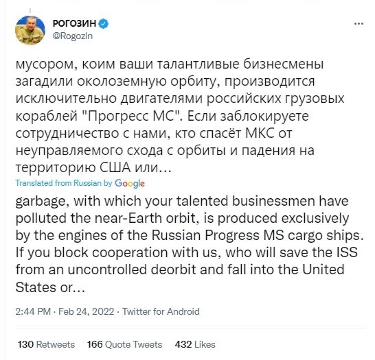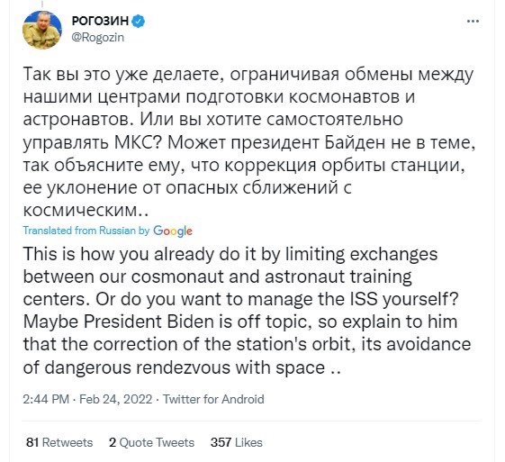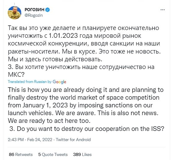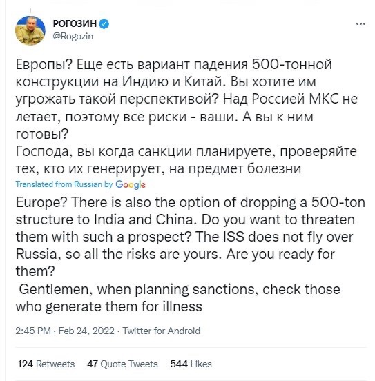 Dmitry dice que Rusia está lista para actuar y amenaza la cooperación rusa en la Estación Espacial Internacional.