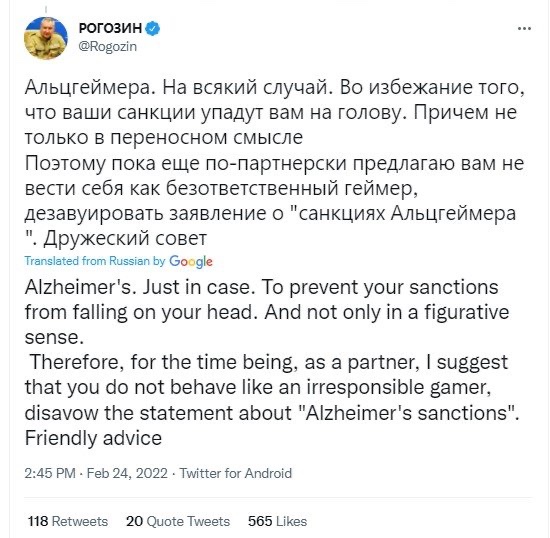 El jueves Dmitry Rogozin calificó las últimas sanciones de Joe Biden como las «sanciones del Alzheimer».