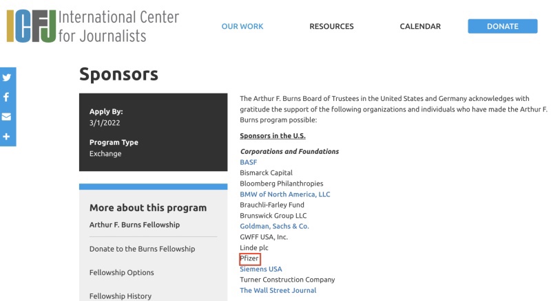 Sin embargo, el socio de verificación de datos de Facebook, ICFJ, también recibe respaldo financiero de Pfizer, con su recientemente anunciado Arthur F. Burns Fellowship, que lleva el nombre de un expresidente de la Reserva Federal, enumera al gigante farmacéutico como uno de los patrocinadores del programa.