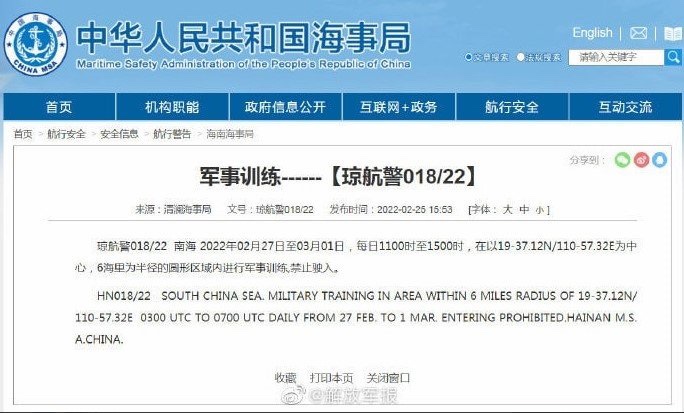 El gobierno comunista chino anunció ejercicios militares en el Mar de China Meridional de domingo a martes.