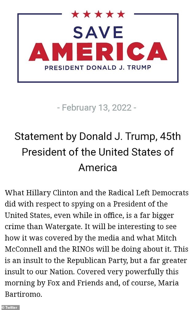 «Se demostró que tenía razón sobre el espionaje, ¡y se me demostrará que tenía razón sobre 2020!» escribió, insistiendo en que también se confirmarán sus afirmaciones de fraude e intromisión en las elecciones presidenciales de 2020.