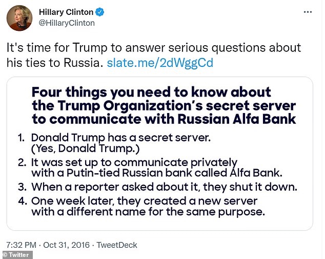 Mientras se postulaba para el cargo más alto de la nación, Clinton impulsó la narrativa de que Trump se estaba comunicando en secreto con los rusos a través del Alfa Bank del país.