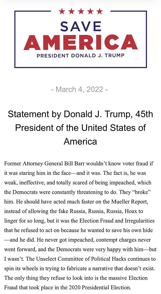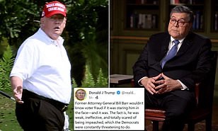 «El ex Fiscal General Bill Barr no sabría el fraude electoral si lo mirara a la cara, y lo fue», dijo Trump en un comunicado el viernes por la noche.
