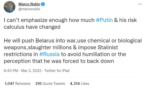 El senador de Florida Marco Rubio pronto siguió con afirmaciones de que Putin «utilizaría armas químicas o biológicas» y «mataría a millones». Este mismo Marco Rubio ha sido un defensor de la expansión de la OTAN, la misma política que contribuyó al medio ambiente que llevó a la invasión de Rusia.
