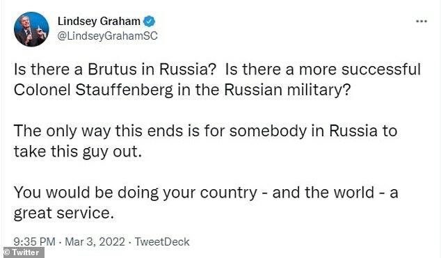 El jueves, la senadora Lindsey Graham, miembro desde hace mucho tiempo del partido de guerra Washington D.C., pidió el asesinato del presidente ruso Vladimir Putin.